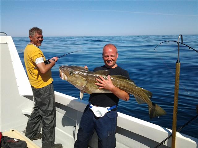 Vandaag gaan we met alle deelnemers naar een wrak van een U-boot op zo�n 35 mijl uit de kust en op zo�n 80 meter diepte. Hier zouden de echt grote kabeljauwen moeten zwemmen en de verwachtingen waren dan ook hoog. We waren de fjord nog niet uit, of iedereen had zijn zwaarste pilkers en cutbaits alvast aan de hengels geknoopt. De heenreis was een schitterend gezicht. De 5 bootjes voeren met vol gas in een V-formatie op een spiegelgladde zee en onder een strakblauwe hemel naar het wrak. Na precies 2 uur varen bereikten we onze bestemming. Het was even zoeken naar de vis, maar toen kwamen dan ook de meest monsterlijke kabeljauwen aan boord. Al vrij snel ving Michel een kabeljauw van 126 cm en niemand dacht dat dat nog overtroffen kon worden. Het bleek anders te zijn. Iedereen ving uiteindelijk een kabeljauw van 120+ cm en aan het eind van de dag hadden we beide kisten vol met vis, waarvan er 14 langer waren dan een meter. Het record op onze boot werd gevestigd door Haddie, die een kabeljauw van 132 cm en 24 kilo ving! Teun ving verder nog een leng van 115 cm en Arjen een koolvis van 110 cm. Al met al een topdag en met meer dan 500 kilo vis aan boord gingen we weer op huis aan. Onderweg zagen we nog twee witsnuitdolfijnen (moeder met kalf), die sierlijk aan de oppervlakte door de golfjes sprongen.