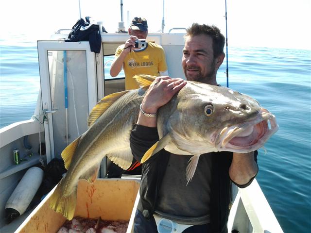 Vandaag gaan we met alle deelnemers naar een wrak van een U-boot op zo�n 35 mijl uit de kust en op zo�n 80 meter diepte. Hier zouden de echt grote kabeljauwen moeten zwemmen en de verwachtingen waren dan ook hoog. We waren de fjord nog niet uit, of iedereen had zijn zwaarste pilkers en cutbaits alvast aan de hengels geknoopt. De heenreis was een schitterend gezicht. De 5 bootjes voeren met vol gas in een V-formatie op een spiegelgladde zee en onder een strakblauwe hemel naar het wrak. Na precies 2 uur varen bereikten we onze bestemming. Het was even zoeken naar de vis, maar toen kwamen dan ook de meest monsterlijke kabeljauwen aan boord. Al vrij snel ving Michel een kabeljauw van 126 cm en niemand dacht dat dat nog overtroffen kon worden. Het bleek anders te zijn. Iedereen ving uiteindelijk een kabeljauw van 120+ cm en aan het eind van de dag hadden we beide kisten vol met vis, waarvan er 14 langer waren dan een meter. Het record op onze boot werd gevestigd door Haddie, die een kabeljauw van 132 cm en 24 kilo ving! Teun ving verder nog een leng van 115 cm en Arjen een koolvis van 110 cm. Al met al een topdag en met meer dan 500 kilo vis aan boord gingen we weer op huis aan. Onderweg zagen we nog twee witsnuitdolfijnen (moeder met kalf), die sierlijk aan de oppervlakte door de golfjes sprongen.