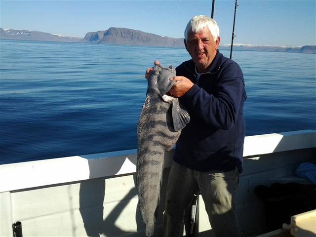 Een tegenvaller. Waar we namelijk geen rekening mee hadden gehouden is dat onze visgids Tom vandaag een vrije dag had. Is hem van harte gegund natuurlijk, maar dit hield wel in dat wij geen diesel konden tanken en na de verre tocht van gisteren stond de brandstofmeter al angstvallig laag (de 130 pk dieselmotor verbruikt bij vol gas al gauw zo�n 25 liter per uur). Om gewicht te besparen besloten we om zelf te proberen om de kraan te bedienen waarmee de vis gelost wordt. Dit bleek supersimpel te zijn (met dank aan Ronald, onze technische man) en er stond zelfs nog ijs op de kade, waar wij dankbaar gebruik van hebben gemaakt. Maar goed, naar het wrak konden we niet en veel zin om de �kleine� kabeljauwen binnen te halen hadden we eigenlijk niet. Dit klinkt erg verwend, maar bij het vissen in IJsland raak je echt ontzettend snel verpest. We besloten om vandaag dan maar eens op de zeewolf te gaan vissen, op een aanbevolen stek iets ten noorden van onze fjord. Vol goede moed gingen we op weg. Het was vandaag weer eens windstil en er hing een behoorlijk dichte en koude zeemist voor de kust. Bij het uitgooien op de eerste stop bleek dat we daar geen zeewolf zouden vangen. Steeds hing er kabeljauw aan de lijn, nog voordat we de bodem hadden bereikt. Ronald en Michel zijn na een poosje overgestapt op spinhengels, en het was heel aardig om te zien hoe zij moesten werken om de kabeljauwen van zo�n 50 tot 70 cm binnen te halen. Na een aantal keren verkassen bleek dat de zeewolf vandaag geen zin had om te bijten. Wel vingen Haddie en Michel nog een koolvis van 100 en 108 cm en juist op het moment dat we besloten om te stoppen ving Arjen de gewenste zeewolf. Deze vis van een kleine meter lang hebben wij in de haven in moten gesneden en �s avonds heeft Teun er een heerlijke maaltijd van bereid.