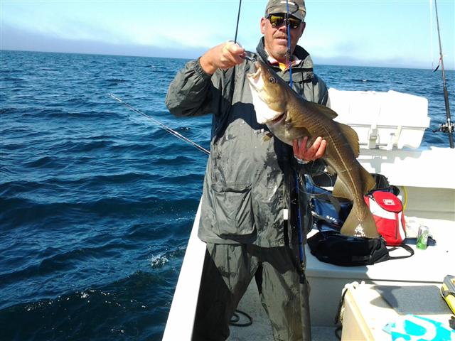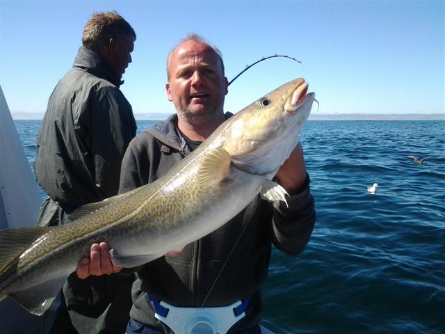 Deze eerste dag was echt top! We hebben de stekken 2, 3 en 6 bezocht. Het was windstil, de zee was spiegelglad en het was uitgooien en binnenhalen! We vingen veel kabeljauw tot 80 cm, een enkele schelvis en 2 mooie zeewolven. Kist 1 was aan het einde van de dag bijna helemaal vol en aan de hand van het aantal vissen in de kist en de pijn in onze armen schatten wij het gewicht op zo�n 300 a 400 kilo. En dan hadden wij nog veel �ondermaatse vis� (tot 60 cm) teruggezet en veel ge�xperimenteerd met lijnen, gewicht en aas - voornamelijk pilkers en shads.