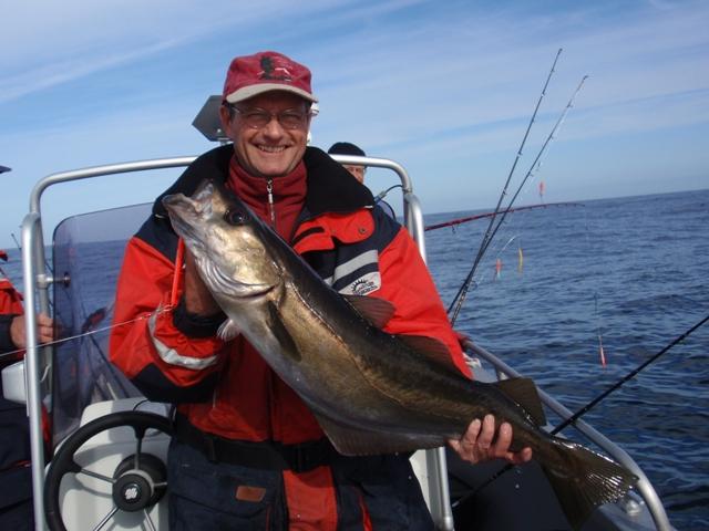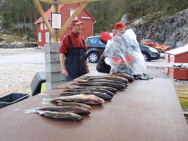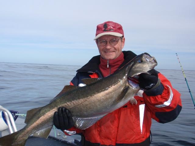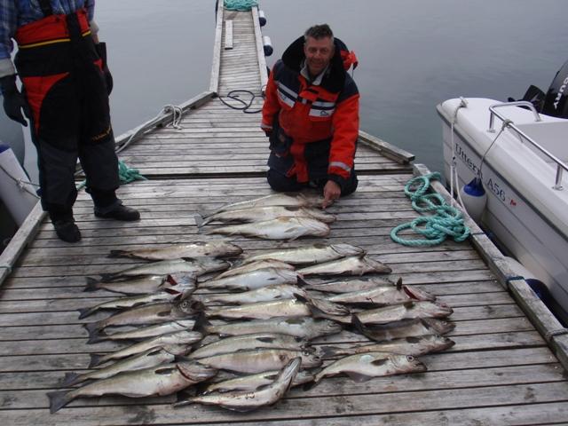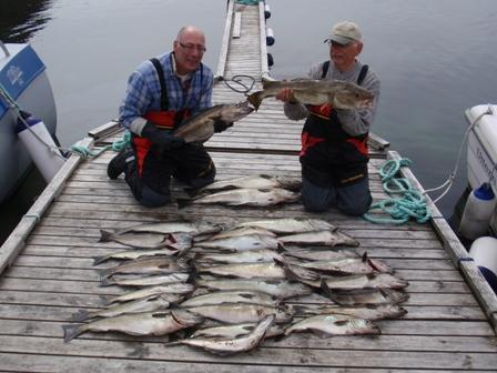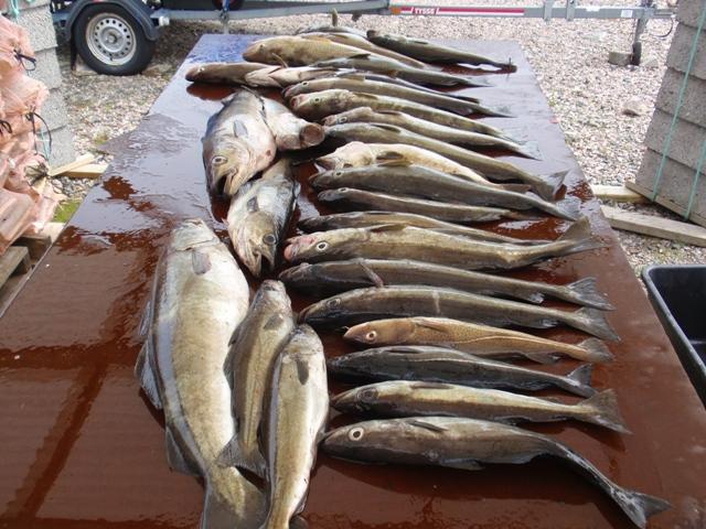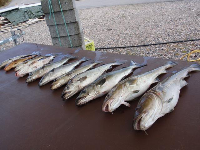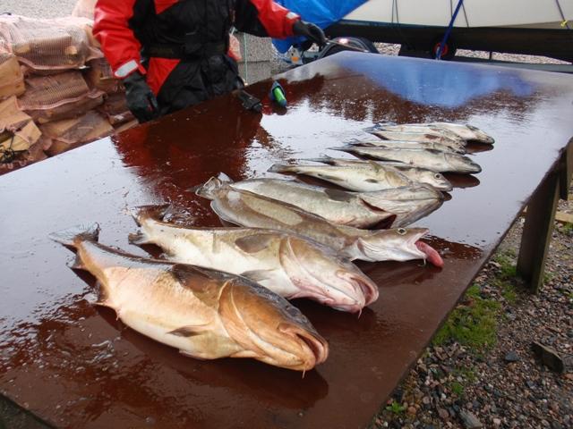 Om half acht voeren we over een spiegelgladde zee het fjord uit om even later in de vaargeul van deze stek terecht te komen in een deining van 2meter. Het ene moment zag je in de verte nog land om even later tegen een muur van water aan te kijken. Frappant was wel dat er geen drift was en de boot veilig en stabiel op dezelfde plek bleef liggen. De shads scoorden weer goed en wedijverden met de Dieter Eiserle pilkers. In goed twee uur vingen we pollakken van 88 en 85 cm. en even grote gullen. De 34 vissen leverden dikke files van in totaal 41 kg. op. Rekenkundig is dat: 2 uur vissen + 4 uur fileren = 41 kg. vis.