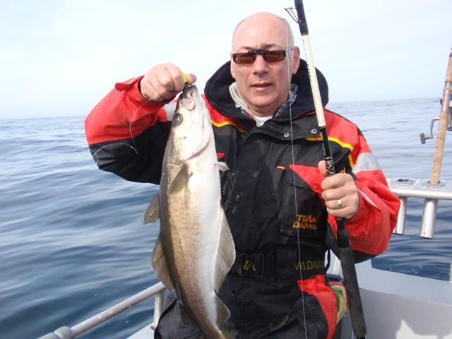 Om 8 uur uitgevaren langs de steile wand, voorzichtig langs Tekslo om de kool-vissen niet wakker te maken en koers gezet naar de open zee richting stek A, een plek met dicht bij elkaar verschillende dieptes. Wij besloten niet te gaan voor de diepere stukken maar met lichte pilkertjes en shads op zoek te gaan naar pollak en gul. Die werden gevonden op 25 meter diep. Vooral de pollak was volop aan het jagen. Prachtig om te zien hoe ze achter de rood/gele en geel/zwarte shads aanjoegen. Soms pas vlakbij de boot hapten ze fel toe. Wat een mooie sportvis. Na drie uurtjes hard werken, maar bovenal genieten voeren we terug met twee pollakken van 85cm, een gul van 76cm en de andere 26 van beide soorten haalden tussen de 60 en 80 cm. Die drie uurtjes leverden 28 kg. voor de diepvries op.