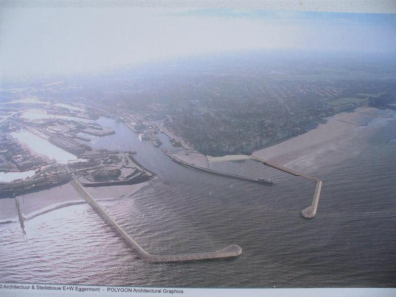 Op de plaats waar vroeger het Oostelijk staketsel van Oostende was, is er nu een gloed nieuwe golfbreker aangelegd. De bedoeling is dat er in de toekomst een nieuwe pier op deze plaats komt. Op bijgevoegde foto�s zien jullie een maquette hoe deze pier of staketsel in afgewerkte toestand zal zijn. Eerst zal de bestaande strekdam of golfbreker nog een aardig stuk verder in zee gaan, (totale lengte van 1 200 meter) en boven op de golfbreker zal men een staketsel bouwen van zes (6) meter hoog. Dit is het eerste project van de bescherming van de Oostendse haven.
