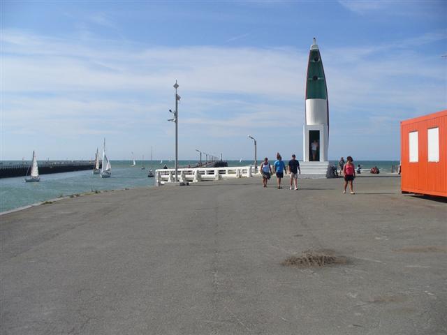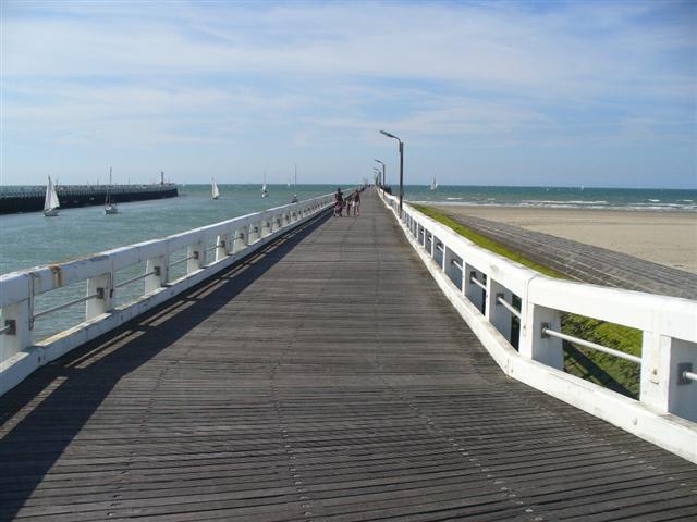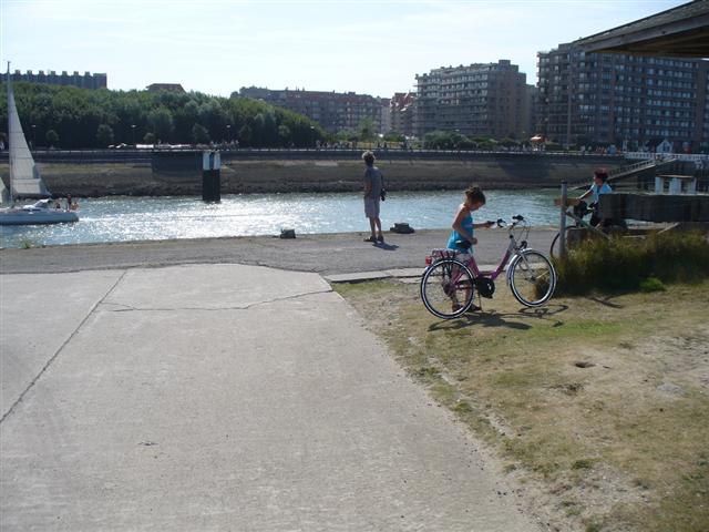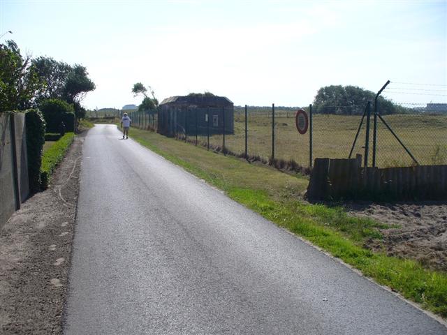 Blijf deze verharde weg volgen. Rechts is de militaire basis van Lombartsijde, Links een natuurreservaat. Op het einde van de weg; je bent met de fiets of bromfiets, dan moet je even zwaar in de ankers of je maakt onverbiddelijk kennis met de vaargeul van Nieuwpoort! Er is geen vangrail, boord of ander obstakel! Ga hier naar rechts en je komt vanzelf op het staketsel of pier!!