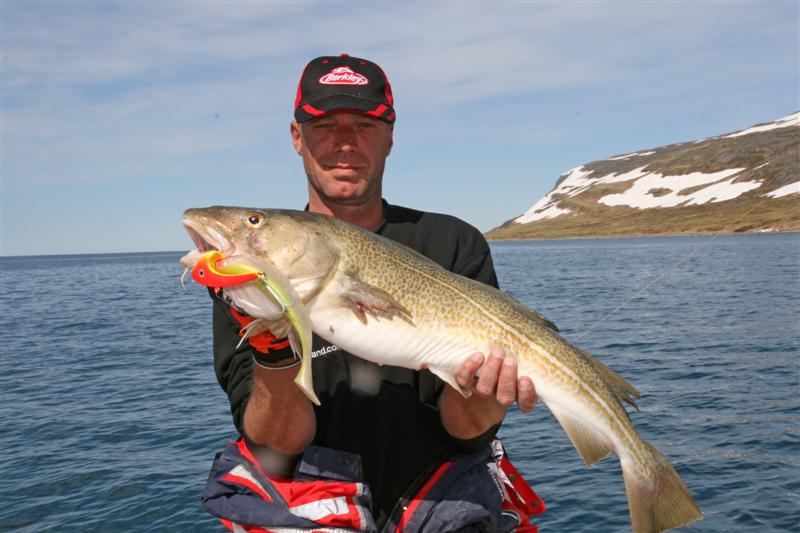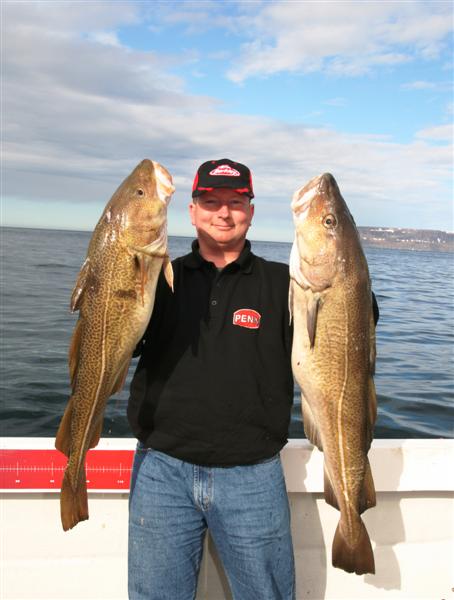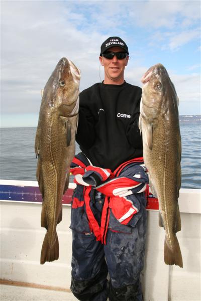 Walter is aan het gevecht met een grote vis, waarschijnlijk Kabeljauw