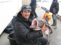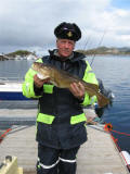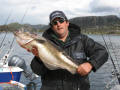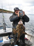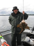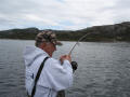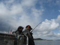 We boffen weer met het weer dus zoeken we toch de wat opere gedeeltes op om een lange drift te maken. En dan gebeurd het hoor, Nol(alias de Stuurman) pakt een mooie heilbot, zeker dik over een meter was deze vis,maar helaas werd deze vis niet geland hoewel hij zich wel had laten zien aan de oppervlakte. De stemming zat er aardig in, er werd niet veel gevangen maar deze vis beloofde toch wel wat, dus we bleven aan ons systeem vast houden om vervolgens de volgende dag weer volle moed het water op te gaan. Het weer was nu toch wel aan het omslaan en we kregen te maken met een paar fikse regenbuien. We bleven nu wat dichter bij de kant wat resulteerde in een mooie zeeduivel van dik 8 kg gevangen door Glen. Tussen de buien door hebben we het nog geprobeerd op het diepe water, maar aangezien de driftsnelheid te groot was moesten we hiermee toch onze meerdere erkennen aan de natuuren het water te laten voor zoals het was.