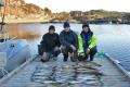 Eerst om 6 uur �s ochtends wakker geworden door de wekker van Arnold, vergeten uit te zetten (was namelijk de bedoeling dat we om half 8 ons bed uit zouden gaan). Om half 8 alleen Arnold uit zijn bed, Jeroen en Menno zijn nog in dromenland. Om 8 uur zijn Jeroen en Menno ook wakker. Lekker even warme broodjes gegeten en toen zagen we Raffie aankomen. Op naar de boot om vervolgens een geweldige visdag te beleven. Onze kapitein Jeroen moest het varen overlaten aan Raffie, omdat Raffie precies de stekken wist en al veel vaker had gevaren met de boot. We zijn begonnen met de lichte visserij. De eerste vis was al snel een feit en dit keer was het Jeroen die de eerste vis ving. Daarna volgden er al snel meerdere, dus overstappen op dezelfde pilker en toen vingen we allemaal vis, behalve Arnold. Na een tijdje vingen we niks meer dus werd het tijd om naar een andere stek te gaan. Daar werd er wederom aardig wat vis gevangen, hier pakte ook Arnold zijn eerste vis van de dag. Nadat we op deze stek klaar waren gingen we proberen met zwaar materiaal. Raffie had meer dan genoeg makreel mee, dus qua aas kwam het goed. De makrelen van Raffie waren echte wedstrijd makrelen, deze waren 2x zo groot als degene die wij hadden gekregen aan het begin van de week. Op de volgende stek aangekomen, de hengels in orde gemaakt en vissen maar. De eerste vis diende zich al snel aan bij Raffie op de havfiskeboom, een kleine Lom van een cm of 60. Daarna ving Jeroen een Lom op de pilker, ongeveer zelfde maatje. Vervolgens dacht Arnold dat hij een hele grote had, maar hij bleek vast te zitten. Geprobeerd los te krijgen, maar helaas zijn lijn brak en hij moest opnieuw zijn hengel klaarmaken. De vissen bleven ondertussen maar binnenstromen, het was af laten zakken naar de bodem en je had meteen beet. Het waren helaas alleen maar Lommen en deze konden we niet echt gebruiken. Dus we hebben een hele vracht Lom weer terug gegooid. Eindelijk had Arnold zijn hengel weer klaar en nadat hij aas op de haken had gedaan liet hij zijn havfiskeboom weer opnieuw naar de bodem zakken. Hij was nog maar net beneden of hij kreeg een geweldige aanbeet. Dit leek wel een behoorlijk grote vis aan zijn hengel te zien en de moeite waarmee hij de vis omhoog kreeg. Toen de vis zich eindelijk liet zien bleek niet dat het 1 vis was maar waren het er 3. Een Lom viel er af voordat we hem de boot op konden krijgen, maar er bleven nog een Lom en een Leng aanzitten. De Lom was standaard maatje maar het was een flinke Leng. Dit was de eerste Leng van de dag. Hierna gingen we weer verder naar een andere stek en toen gingen we weer met de lichte visserij. Dit omdat we de Lom een beetje zat waren. Op de stek waar we toen aankwamen werd niet veel gevangen, dus gingen we naar een andere stek. Hier werd ook niet veel gevangen terwijl er toch veel vis was te zien op de dieptemeter. Het was inmiddels 3 uur �s middags en we begonnen te twijfelen welke plek we zouden doen, of verder de open zee op of naar een eilandje even verderop. We hadden uiteindelijk gekozen voor de plek op de open zee. Dit bleek een geweldige keuze te zijn geweest, want de eerste vis die zich aandiende knalde vol door de slip van Raffie. Dit moest een geweldige vis zijn en Raffie had zijn twijfels erover of hij hem wel binnen kon halen. Na een gevecht van meer dan een kwartier kwam de vis uiteindelijk boven en stonden we met zijn allen klaar om Raffie te helpen om de vis binnen te halen. Menno had inmiddels handschoenen aangetrokken zodat hij de vis kon pakken zonder zijn handen open te halen aan de tanden van de enorme Gul. De vis geland en een aantal mooie foto�s geschoten. Jeroen had de dril ook mooi gefilmd met de camera van Raffie, dit komt waarschijnlijk ook op zijn nieuwe dvd. Na deze geweldige dril was Raffie even klaar vissen om even bij te komen van de uitputtende ervaring. Later op de kant bleek deze gul ongeveer zelfde maat te zijn als de gul die Arnold de dag ervoor gevangen had. Deze had hem echte op zwaar materiaal gevangen en dat was toch een stuk makkelijker binnenhalen. Menno mocht met Raffie zijn hengel vissen en Jeroen en Arnold kregen eenzelfde pilker van Raffie als waar hij mee viste. We waren alleen compleet afgedrift, dus we gingen weer naar het beginpunt toe waar we begonnen toen Raffie zijn vis ving. Het duurde niet lang of we vingen achter elkaar vis. Het was een kwestie van uitwerpen en binnenhalen en succes verzekerd. Enorm veel koolvis en pollak gevangen en we bleven ze maar vangen. Om een uur of 6 �s avonds zijn we dan toch maar gestopt omdat we een beetje het eind in de bek hadden. Het was ook nog zo dat we nog lang niet klaar waren, want we hadden inmiddels een vette berg vis en die moest natuurlijk ook nog gefileerd worden. Rond 7 uur begonnen we met zijn drie�n aan het fileren van de vis, nadat we eerst een foto hadden gemaakt van alle vis uitgelegd op de steiger. Dit was ongeveer 3x zoveel als de dag ervoor. Dan te bedenken dat we ook bijna net zoveel terug gegooid hadden aan Lom en kleine koolvis. Raffie was ook erg behulpzaam, hij ging de boot schoonmaken en de hengels afspoelen. Rond 9 uur waren we pas klaar vis fileren. De filet werd gewogen en het bleek dat we 10 kg filet hadden. Snel naar het huisje, want we waren allemaal compleet gesloopt. Bij het huisje ging Menno kibbeling bakken van de filet van de dag ervoor (frituurpan meegenomen van thuis). Arnold en Jeroen gingen de filets invriezen. De kibbeling smaakte geweldig en we hadden meer dan genoeg. Na het eten waren we helemaal moe en zijn we meteen te bed gegaan. Jeroen ging nog even douchen en nog voordat hij terug was uit de douche sliepen Arnold en Menno al. We waren het er wel over eens dat dit een dag was om nooit te vergeten, ontzettend veel geleerd en met een geweldige visgids gevist.