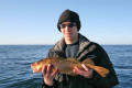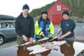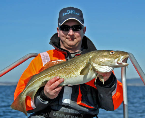 Vandaag maar even rustig aan doen, eerst uitgeslapen tot 9 uur daarna lekker rustig warme broodjes gegeten. Rond 11 uur gingen we nog even vissen, want om 4 uur moesten we terug zijn zodat we nog even naar de supermarkt konden. We gingen als eerste met de lichte hengels vissen op dezelfde stek als waar we gisteren met Raffie waren begonnen. Helaas zat de drift niet erg mee, deze was elke keer anders. Hier waren we dus snel klaar vissen. Toen gingen we verkassen naar een andere stek en daar was het al niet veel beter. Jeroen wist hier nog wel een koolvis te vangen. Ondertussen zagen we dat er behoorlijk dichte mist aankwam in een erg snel tempo, dus maakte we dat we weer richting binnenwater gingen (we waren namelijk op open zee). We gingen toen met zwaar materiaal vissen op de grote leng en op de grote kabeljauw. Dit keer ging de drift wel goed en gingen we van diep (200 m) naar ondiep (80 m). De havfiskeboom hadden Menno en Arnold eraan en Jeroen probeerde het weer met een lichtgevende pilker net als gister. Het duurde even voor we beet hadden, maar opeens kreeg Menno een flinke beuk op zijn hengel. Het was een erg sterke vis aldus Menno, dus we zaten met spanning te wachten op wat voor vis het zou wezen. We hoopten op een dikke kabeljauw of misschien een zeeduivel. Menno had het erg zwaar met de vis naar boven takelen, want door de drift had hij inmiddels misschien wel 300 m draad wat hij nog moest binnenhalen. Hij zat een paar keer vast tijdens het binnenhalen, maar gelukkig kreeg hij hem elke keer weer los. Uiteindelijk kwam de vis naar boven en bleek het een mooie leng van 85 cm en 3,2 kg. Even later had Jeroen beet, de vis spartelde alleen niet erg tegen. We dachten dat dit wel eens een zeeduivel kon zijn, omdat we hadden gehoord dat het net voelt alsof je een vuilniszak binnenhaalt. Arnold had ondertussen ook beet en zijn vis spartelde ook niet erg tegen. We hoopten dus dat een van de twee een zeeduivel had. Arnold had zijn vis als eerste boven en dat bleek een kleine Lom te zijn helaas. Even later had Jeroen zijn vis ook boven, helaas ook een Lom. Maar er zat nog een roodbaars boven, dus Jeroen had weer een nieuwe soort erbij gevangen. Raffie had ons gisteren verteld dat Roodbaars erg weinig werd gevangen, dus Jeroen was hier best trots op. Nog even gevist, maar er werd niet veel meer gevangen en de tijd was om. Tijdens het terugvaren besloot Menno dat hij maar ging slepen met een plug. Arnold dacht van nou ja dat kan ik dan ook wel proberen, alleen verwachtte hij er niet teveel van. Op een gegeven moment zag Jeroen veel vis op de dieptemeter en vlak nadat hij dat gezegd had kreeg Arnold een aanbeet. Hij bleek een koolvis vals gehaakt te hebben. Thuis aangekomen vissen gefileerd en toen naar de winkel. Jeroen bleef in het huisje, want die ging pannenkoeken bakken. Arnold en Menno waren net op weg, toen Jeroen belde. Of we de benzinetanks van de boot ook mee wilden nemen, want die waren we vergeten. Die opgehaald en meteen de portemonnee gepakt, want die waren we ook vergeten. Bij de winkel aangekomen een klein beetje moeite met het pinapparaat vinden, maar toch gevonden. Nadat we hadden gepint gingen we boodschappen doen. Na de boodschappen gingen we tanken. We moesten 3 benzinetanks van de boot vullen � 25l per stuk en de auto moest vol getankt worden. We begonnen met de auto, daarna een benzinetank en daarna de 2e tank. Helaas stopte de benzine ermee, dus of tankstation was leeg of hij was beveiligd. Dus maar betaald en die andere tanks vullen we in de loop van de week wel weer. Daarna gingen we weer naar huis. Thuis aangekomen even kijken bij Jeroen hoe het ging met pannenkoeken bakken. Dit ging erg slecht, dus Arnold nam het maar over. Nu ging het een stuk beter, dus Jeroen ging Menno helpen de auto uitladen. Toen hun klaar waren was Arnold ook klaar met pannenkoeken bakken, dus gingen we lekker eten. Jeroen die at als een malle, waarschijnlijk omdat hij bang was dat hij straks zijn eigen mislukte pannenkoeken op moest eten. De pannenkoeken waren goed te eten en we hadden er genoeg, dus geen kibbeling meer gebakken. Even gekaart en daarna bedachten we dat we toch wel kibbeling moesten bakken, want de Gul filet van eergisteren lag nog in de koelkast en anders konden we dat weggooien. Menno en Jeroen gingen dus nog even staan frituren. De kibbeling smaakte erg goed, er was zelfs teveel. Na de kibbeling zijn we maar gaan slapen, want morgen zou weer een lange dag worden en gingen we weer vroeg ons bed uit.