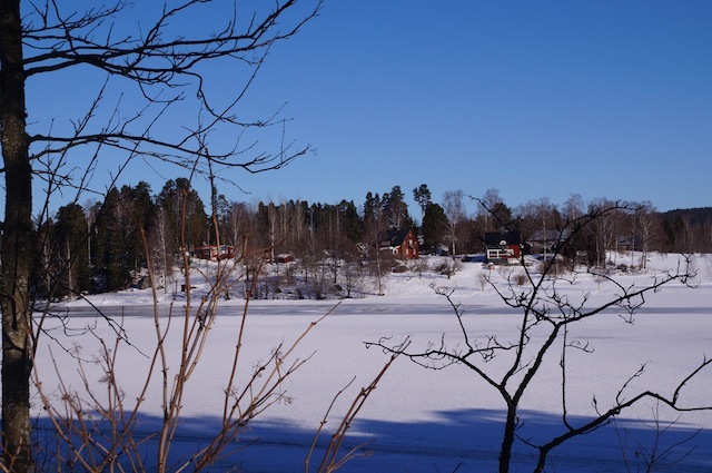 Mijn kennismaking wordt echter vervroegd naar de eerste week van maart. De Zweedse visgidsen waar Raffie contact mee heeft nodigen Raffie, Maurits en ondergetekende uit om alvast met de snoek en snoekbaars van dit gebied kennis te maken. Dat er ongeveer een meter ijs ligt schijnt geen probleem te zijn. Meteen een KLM ticket van nog geen 140 euro (yep retour en inclusief alles) gekocht en na een prima vlucht �alleen de KLM biedt nog beenruimte voor mensen van mijn postuur- landen we in Stockholm. Buiten schijnt de zon, maar vriest het dat het kraakt. Met de huurauto is het nog een uur rijden naar het eerste meer. Dat blijkt dus enkele duizenden hectares groot te zijn. Gelukkig hebben we twee goede gidsen. Wanneer we bij het huisje aankomen gaat de zon net onder over een inmense ijsvlakte en genieten we van een bizar mooi uitzicht. Maurits en ik stappen voorzichtig op het ijs,toch een beetje bang dat we er elk moment doorheen kunnen zakken. Wanneer we even later verschillende dikke Volvo�s over het ijs zien scheuren wordt het vertrouwen groter.