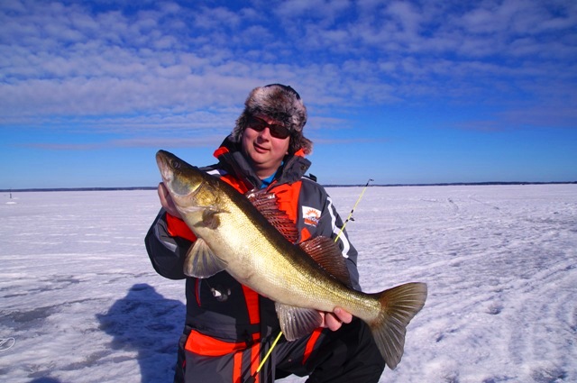 Wanneer we �s ochtends vroeg wakker worden is het buiten -17 graden. Hoe gaan we dit overleven? Gelukkig beschikken we over warme kleding, klimt de zon als snel boven de bomen uit en staat er geen zuchtje wind. Met de gids scheuren we met de auto naar de stekken toe. Hoewel stekken? Midden op het meer zijn met een motorijsboor een aantal gaten van 25 cm doorsnede gemaakt. Onder een meter ijs staat dan nog 11 meter water. Hier moet het gebeuren. De visserij is overigens zeer simpel. Een voorn van 20 cm wordt voorzien van een enkele takel en een loodje van 10 gram op diepte gebracht. Vervolgens wordt er een lusje in de lijn gemaakt wat op lipje van een soort veersysteem wordt geschoven. Bij een aanbeet schiet de lijn van het lipje af en veer er een oranje schijf omhoog. Op deze schijf bevindt zich ook nog een topbelletje. Al snel liggen de hengels erin en kan het ijsvissen beginnen. Het is een kwestie van wachten afgewisseld met het ijsvrij maken van het wak (dat dus in 5 minuten dichtvriest). Al snel staat er bij Raffies wak een beetverklikker te veren en staat onze reisleider een bak van een snoekbaars door het ijs heen te drillen. Het blijkt een magnifieke vis van ca 5 kilo te zijn. De beide gidsen zijn niet onder de indruk, dat schijnen ze pas boven de 7 kilo te worden. Let wel, je heb het hier over vissen die zo�n 80 cm lang zijn en bizar hoog gebouwd. Jammer dat we weinig tijd voor de foto�s hebben, de vis moet vanwege de kou meteen weer terug. Kan overigens niet wachten tot ik hier in juni met de boot, visvinder en een doos vol shads terug ben. Even later krijg ik weer beet. Helaas een losser. Daarna wordt het stil. Geheel onverwacht stapt de gids in de auto en begint rondje over het ijs te rijden. Daarna blijkt te werken want ineens krijgen we aanbeet na aanbeet. Bizar! Zelf vang ik nog een paar zeer fraai getekende snoeken, de grootste ca 85 cm. Dat je hier snoek en snoekbaars door elkaar heen vangt is overigens heel normaal. In tegenstelling tot Nederland blijken beide soorten elkaar prima te verdragen.