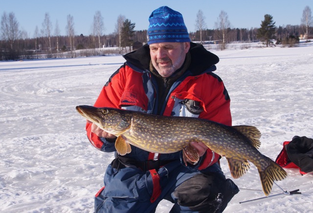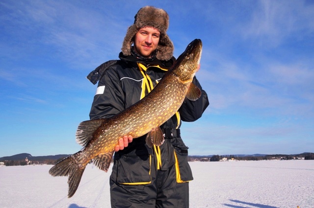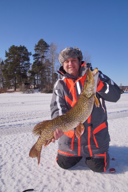 De laatste visdag is het -22 graden. We zijn gek om met dit weer te gaan vissen! Toch doen we het. Mannen van stavast! Bikkels van de poolnacht, Ridders van de Ronde Ijsberg! De eerste vis van mij vecht als een bezetene en gaat net over de meter heen. Wanneer de snoek boven komt wordt er zeer snel en vakkundig door de gids gewerkt. Vis nat houden, foto maken, onderdompelen, wegen en hup weer terug. In nog geen tien seconden is alles voorbij. Wel jammer, want ik wil dit soort prachtvissen langer kunnen bewonderen. Vissenwelzijn staat bij de gidsen hoog in het vaandel, reden dat het snoekvissen hier gelukkig Catch & Release is.
