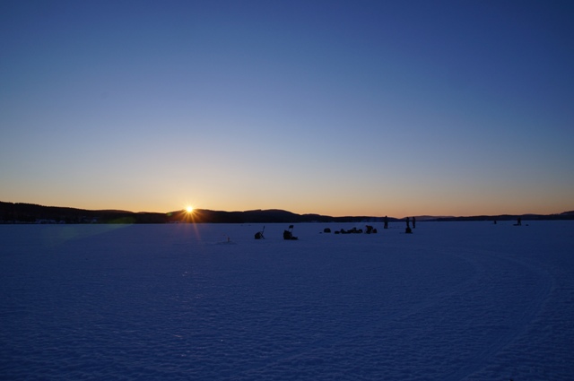 De volgende twee dagen vissen we in een iets noordelijker gelegen meer. Volgens de gids zit hier vooral grote snoek. Probleem is alleen dat de temperatuur inmiddels tot -21 graden is gedaald. Bij dergelijke lage temperaturen bestaat de kans dat de visserij op zijn gat gaat. Gelukkig staat er geen wind. Volgens de gids hebben we de meeste kans in de vroege ochtend. Nu willen we ons natuurlijk niet laten kennen en om half 6 staan we op het ijs. Koud, erg koud, steenkoud zelfs! Maar wel genieten van een immens mooie zonsopgang. De visserij is hier weer hetzelfde alleen wordt er gebruikt gemaakt van een soort drijvend schijfje waar de lijn doorheen loopt. In het gaatje wordt wat anti-vries gedruppeld zodat de lijn niet in het ijs dichtvriest. Geheel onverwacht krijgen we toch aanbeten en vangt Maurits een dikke tachtiger en Raffie een prachtige vis van 98 cm. Opvallend dat Zweden hun vissen niet meten, het boeit ze letterlijk geen meter. Gewicht dat is alles wat hier in Zweden telt. De rest van de ochtend genieten we van een schitterende zonsopkomst en groepen edelherten die over het ijs denderen.