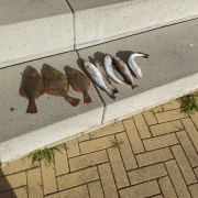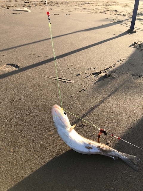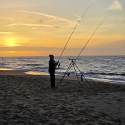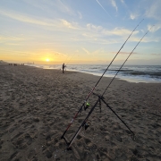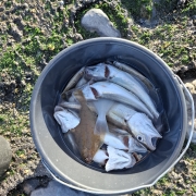 Veel twijfel of we niet helemaal daar weg zouden gaan maar het alternatief was dan het Haagse havenhoofd, Rotterdam of juist IJmuiden. Niet echt lekker rustig zitten met mooi weer op de zondag dus maar gebleven. Direct na het besluit kondigde de eerste maatse baas zich aan. Ook de botvangst werd beter met duo’s en triplets. Uiteindelijk toch met zn drieën zeker 60/70 vissen gevangen en we met een deel daarvan twee emmers vol eetbare vis konden vullen. De vangsten hielden aan totdat we bijna tegen de duinen stonden en toen in het donker vertrokken. Geen wijting. Waarschijnlijk te ondiep daar.