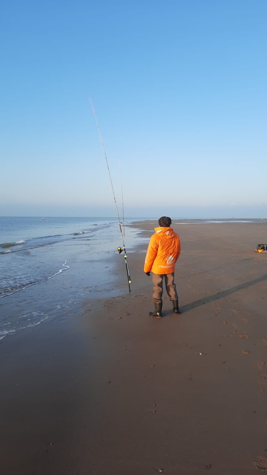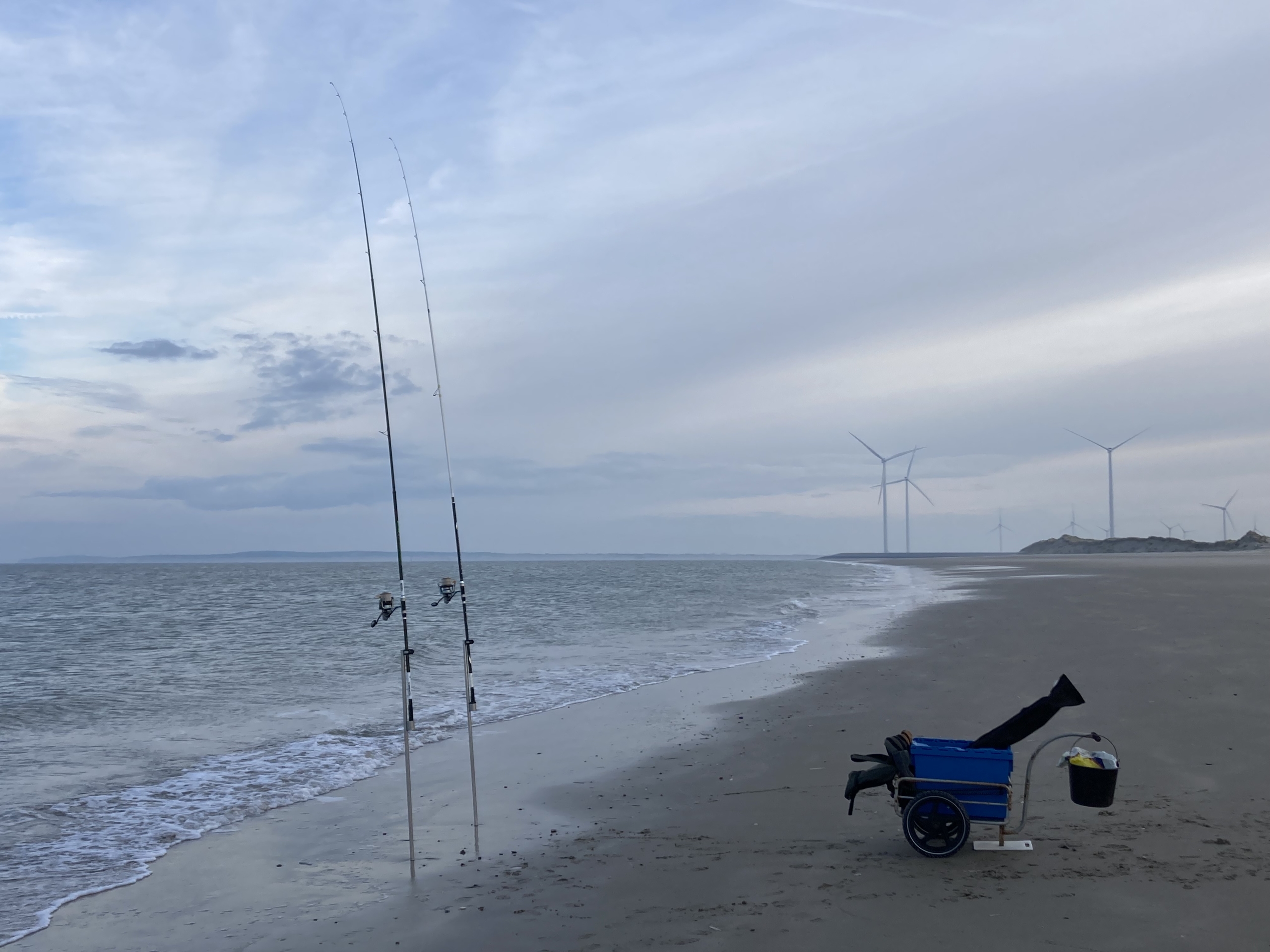 Het was de bedoeling om op tijd te beginnen vanwege het tij (9:50 laag) en het weer. Maar met twee visdagen in het ouder wordende lijf lukte dat niet helemaal. Uiteindelijk stonden we om half tien aan het water. Gezien de windrichting dit keer aan de Banjaard, recht voor de afgang bij Frituur Parkzicht. In eerste instantie stonden we oostelijk van het hoopje stenen wat daar in het water ligt. Bij het inhalen van de eerste worp zaten 3 van de 4 hengels vast, waarbij er 2 weer loskwamen en 1 het tuigje verloor. Daarom zijn we 100 m westelijker verhuisd. Daar leek het schuiner af te lopen en hebben we niet meer vast gezeten.