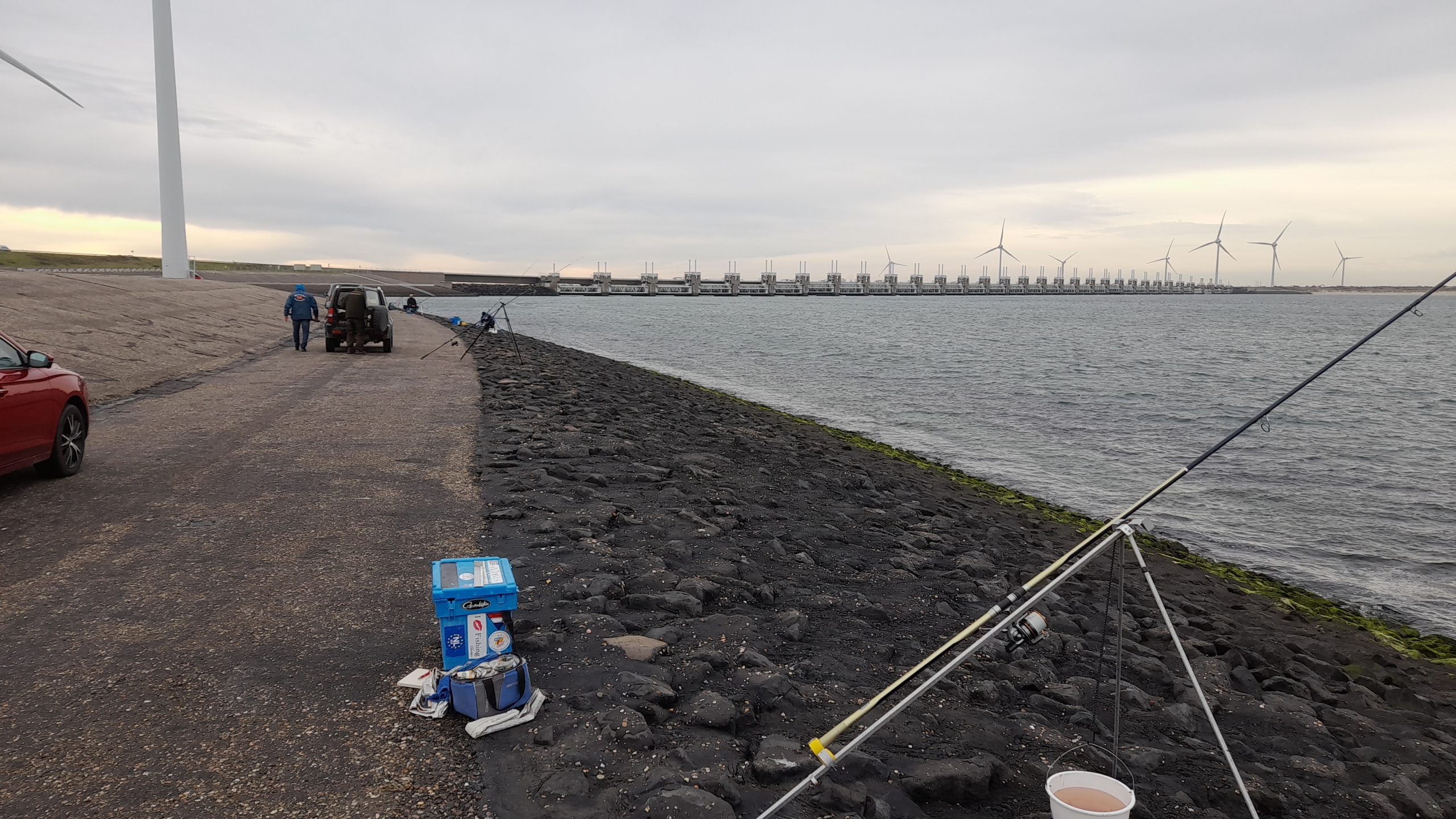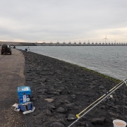 Zaterdagmorgen hielden we onze 2e wedstrijd voor dit seizoen. Plaats van handeling was de autopier bij de trailerhelling op Neeltje Jans. Dat is geen peuterparcours, maar een stek met diepwater, veel stroming, zeer comfortabel maar ook een heel erg wispelturig parcours. De lange latten mee, klapankers in de koffer en een driepoot. In de koelbox de laatste piertjes en zagers overgehouden van ons Friesland ervaring van vorige week. Deze keer 5 deelnemers aan de start. Ik had het lage kopnummer getrokken aan de kant van de grote bolder. Gelijk bij de eerste en tweede worp al een mooie schar, dat begon goed. Even water kwamen ook Henk en Wim van de nul af, maar Dirk en Frits hadden blijkbaar een slechte bodem met alleen materiaalverlies en ergernis tot gevolg. Wim deed intussen op het ander kopnummer goede zaken met ook een schar van 28 erbij. Tijdens de kentering kon ik een paar worpen zonder klapankers doen, maar na de hoogwaterkentering waren er weer ankers nodig om de boel op zn plek te houden. Mn voorspoedig start kreeg geen gevolg, ik bleef steken op die twee scharren van elk 25 cm. Wim en Henk kwamen elk tot vier stuks met de volgende uitslag: