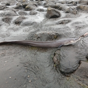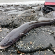 Verhip, na enig gedoe deze gevederde vriend kunnen bevrijden en weer laten vliegen. In afwachting de wijtingen en scharren van hun ingewanden ontdaan, dan toch beet op een van de stokken. Niet wild maar onmiskenbaar tikken van vis, een verdwaalde wijting onder de kant? Bij binnendraaien redelijk zwaar en een op hol geslagen hoofd: wat hangt er hier aan?? Tot mijn verbazing kwam er een mooie congeraal uit het water te voorschijn! Deze slang zwemt weer… Wat een hobby! De waterkant lonkt weer eens temeer…