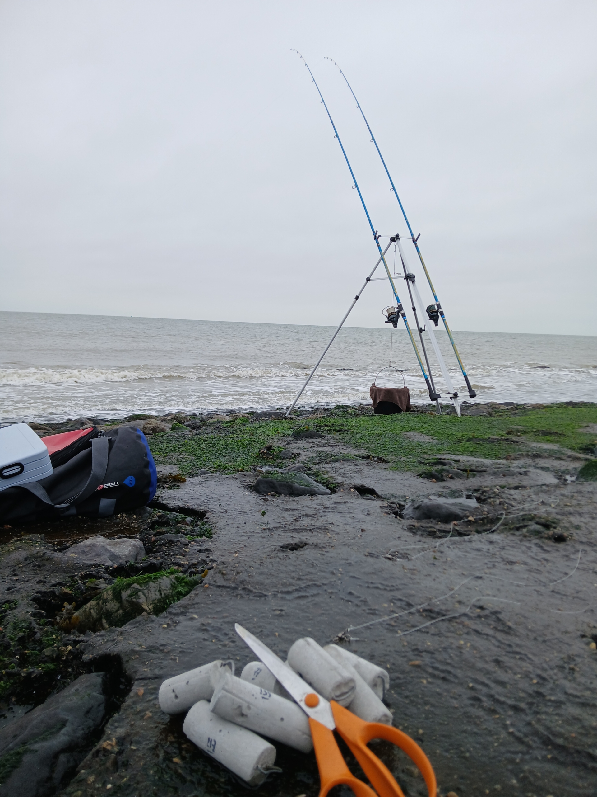 Plots was er een vissersclub neergestreken met 7 heren van respectabele leeftijd. Dat ze afgeproken hadden op deze plek en de planning ging niet aangepast worden… Algehele verbijstering bij ondergetekende en zodra er ostentatief opgetuigd werd aan weerszijde op enkele meters afstand wist ik dat de lol er af ging zijn. 5 min na het startsignaal binnengedraaid en natuurlijk hopeloos in de war met een der nobelen die overigens ongeankerd aan het vissen was. Nog een half uurtje geprobeerd te vissen maar begon er zwaar de pest in te krijgen op deze manier. Dan het roer omgegooid en opgehoepeld, stukje terug gereden en opnieuw beginnen vissen op een lege dijk aan de vuurtoren. De vispret begon er terug in te komen en er kwamen met het opkomend getij geregeld mooie wijtingen en scharren boven. Bovendien bleef de voorspelde harde wind redelijk achterwege. Verder leuk gevist tot 4 uur na laag om dan over te schakelen op een lijn met betonnen gewichtje aan kartonnetje geniet, zoals de blokken visserij op de pieren te ijmuiden. 1 zijlijn op een drieweg wartel met 5 pieren op gerijgd, vergezeld van een stuk wijtingfilet en inktvis uit de vriezer omwikkeld met bait elastic. Dit om eens te proberen net achter de stenen richel iets groter te verleiden. Vorige winter 2 keer tijdens het wijting vissen in zoutelande afgebeten vis binnengedraaid, enkel vissekop aan de haak. Op zoek dus naar die mysterieuze wijtingverslinder…