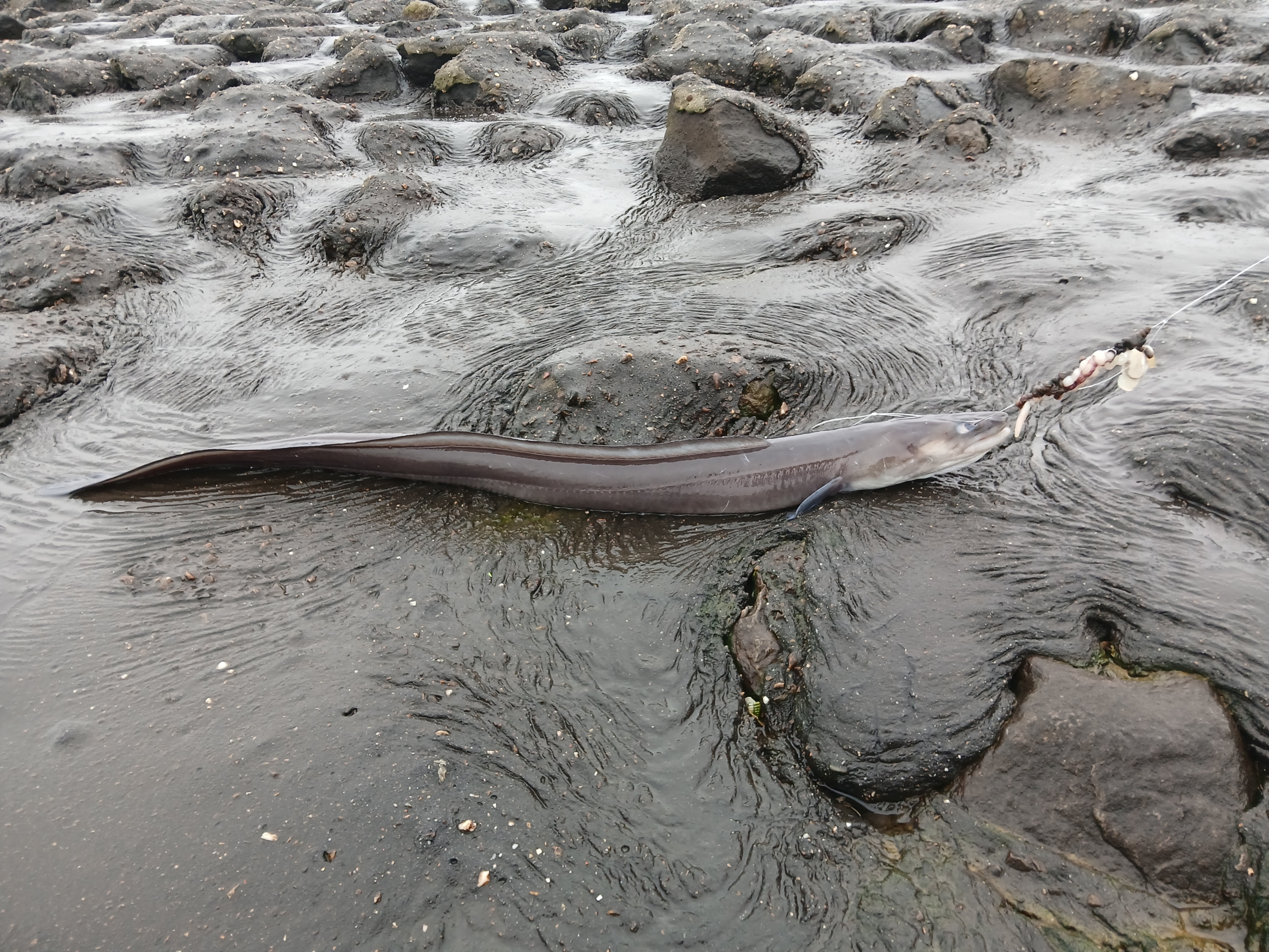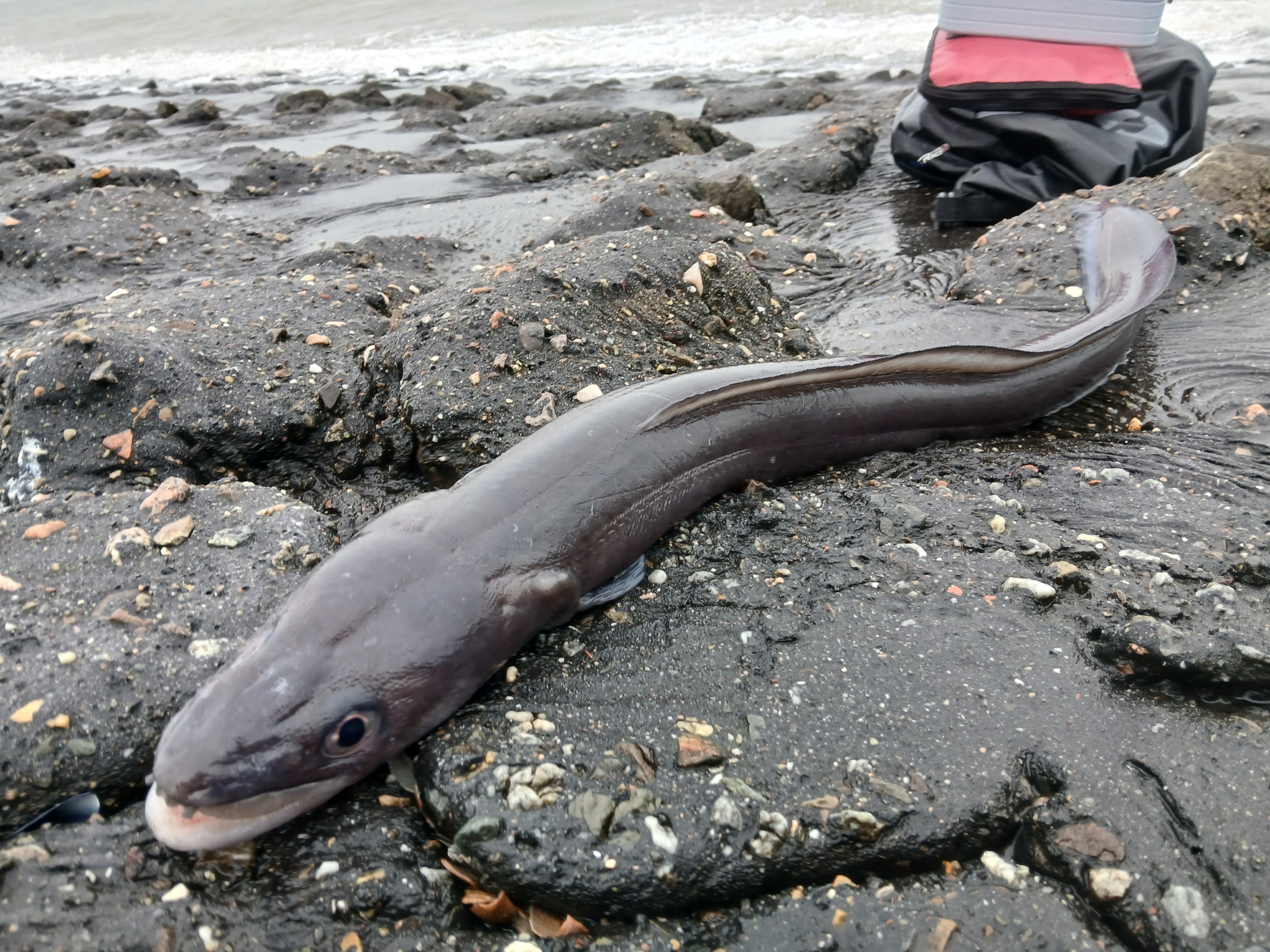 Verhip, na enig gedoe deze gevederde vriend kunnen bevrijden en weer laten vliegen. In afwachting de wijtingen en scharren van hun ingewanden ontdaan, dan toch beet op een van de stokken. Niet wild maar onmiskenbaar tikken van vis, een verdwaalde wijting onder de kant? Bij binnendraaien redelijk zwaar en een op hol geslagen hoofd: wat hangt er hier aan?? Tot mijn verbazing kwam er een mooie congeraal uit het water te voorschijn! Deze slang zwemt weer… Wat een hobby! De waterkant lonkt weer eens temeer…