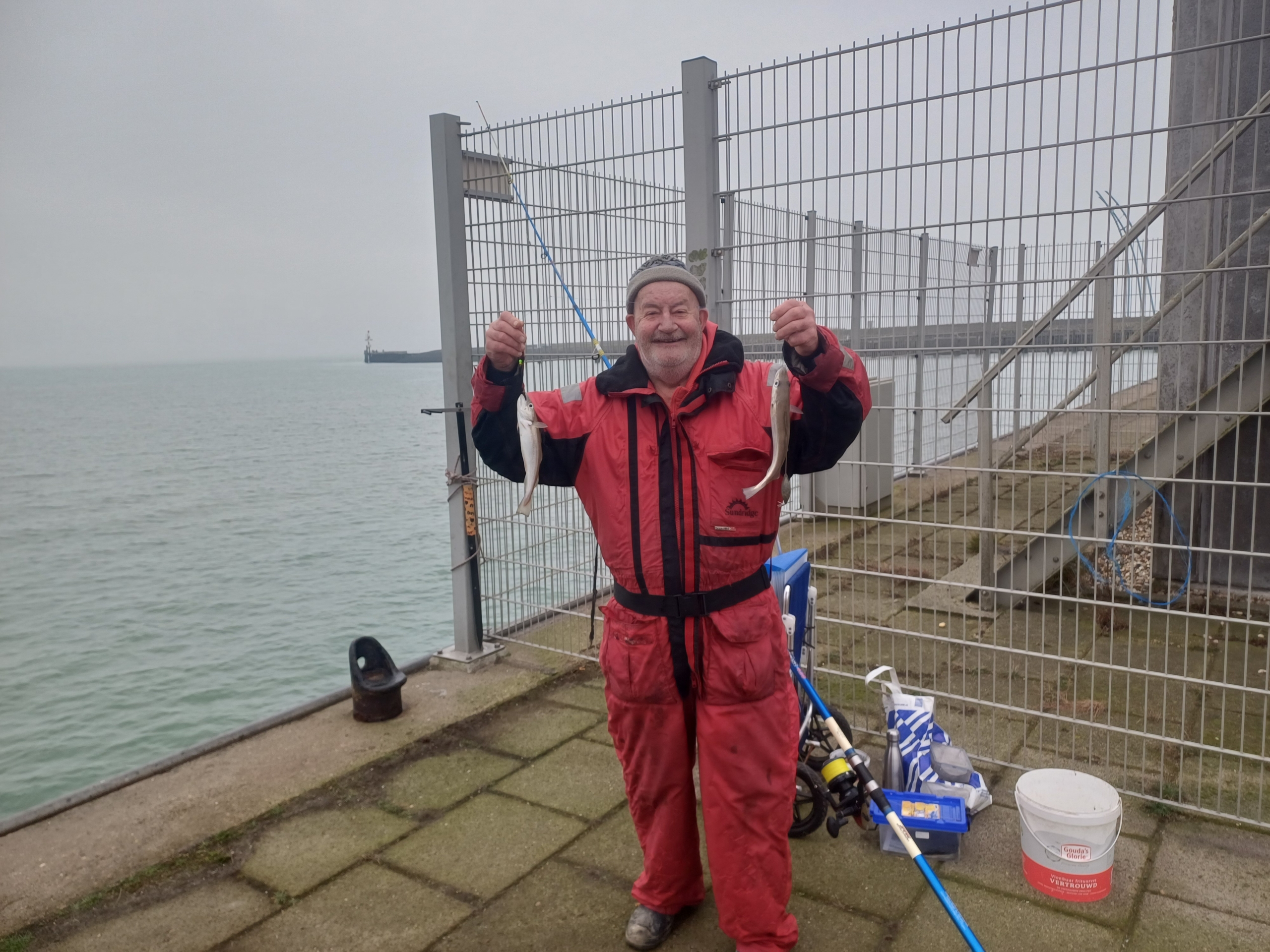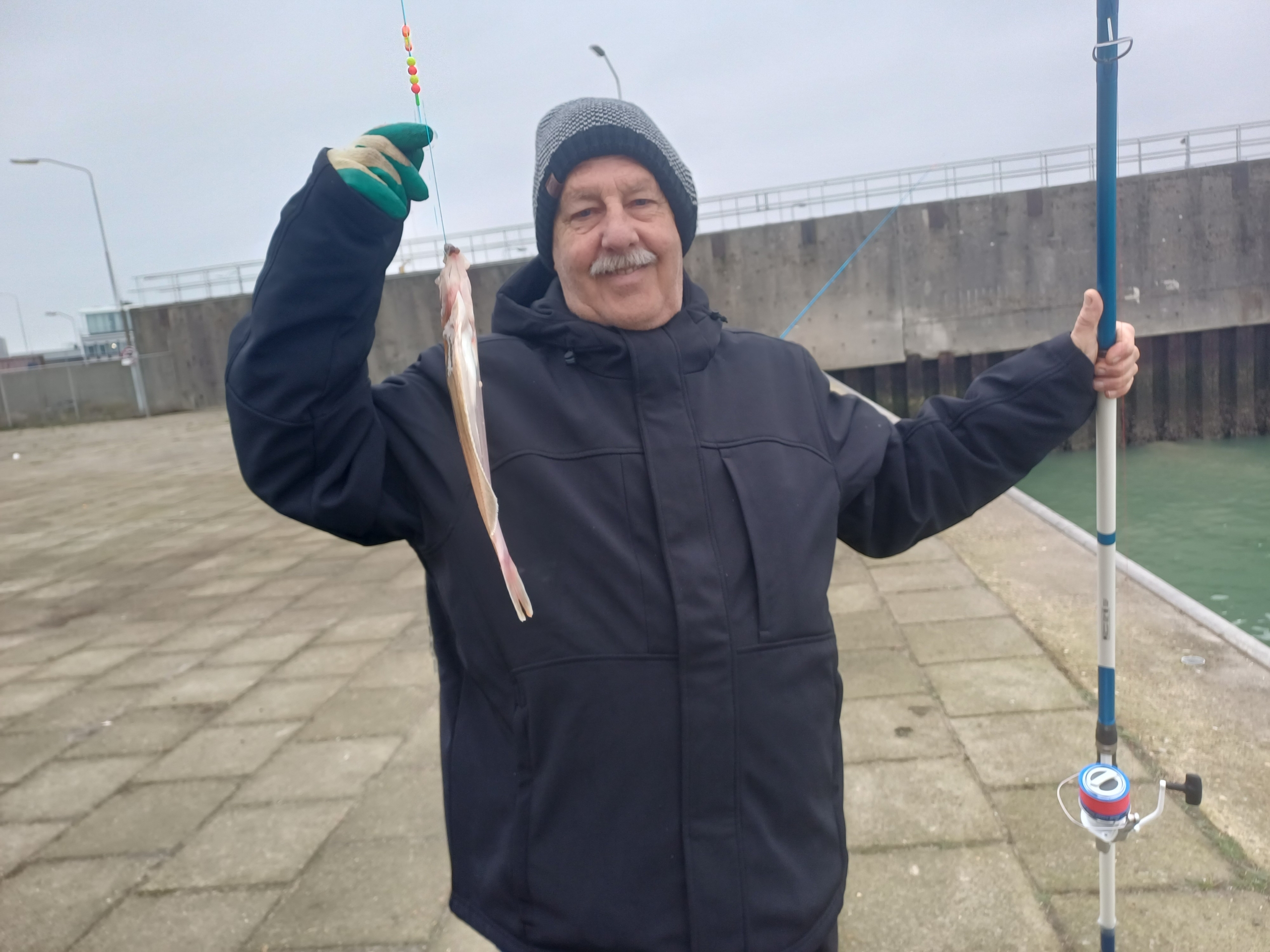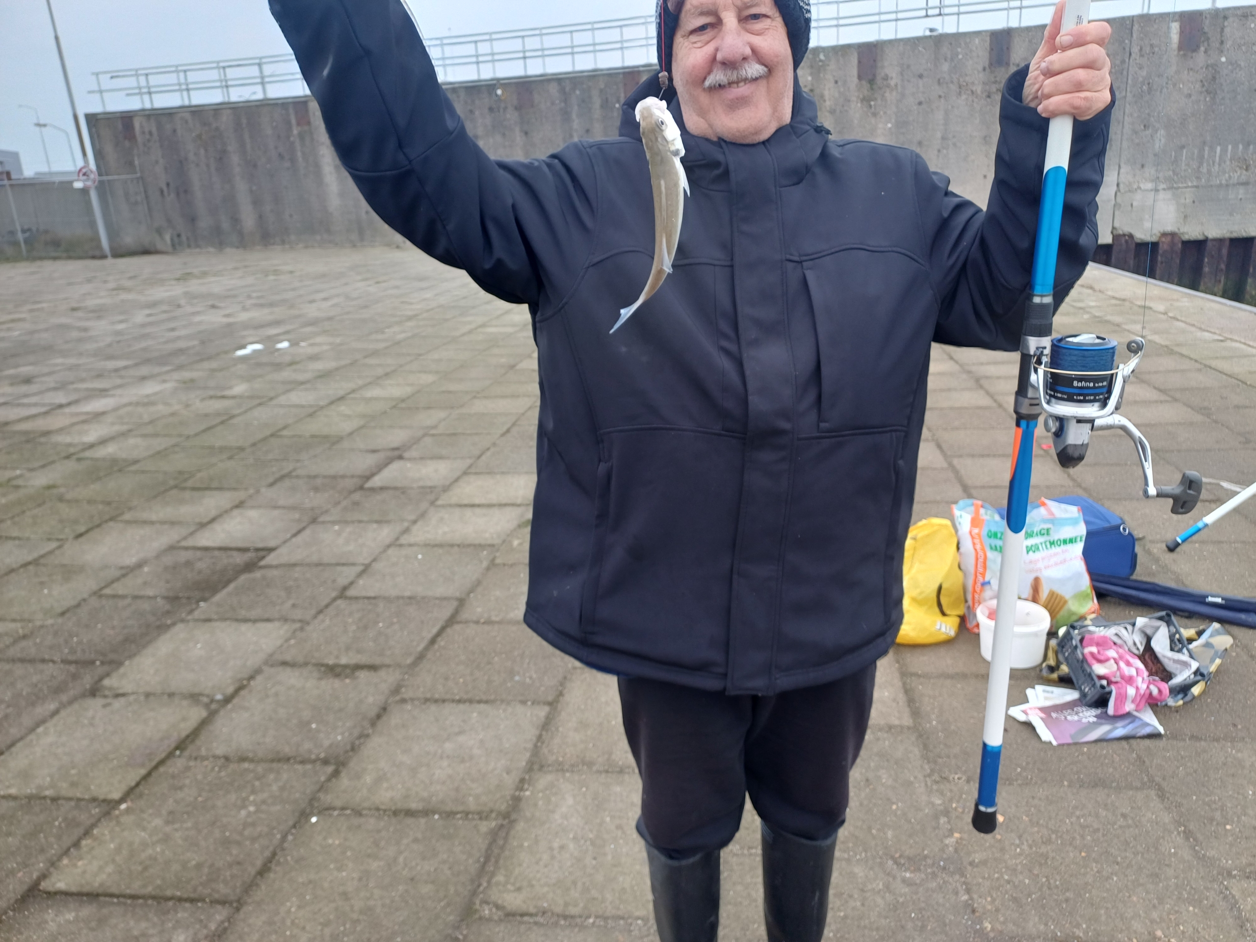 Zo we hadden afgesproken om te gaan vissen vrijdag de 12 december met me broer de pieren besteld bij de familie van dixhoorn was weer prima verzorgt en vertrokken na de stijger maar dat viel vies tegen geen plek dus na strand maar daar moet je betalen om gratis te staan later dus gebouwtje maar aangekomen moesten we weg handhaving zij hier mag je niet komen met de auto inverband met troep achterlaten dus maar gaan vissen auto op parkeer plaats gezet en alles klaar gezet een vissen en klopt er werd goed gevangen tot dat er 1 kwam vissen die roet in gooie die kon niet in gooide spoorniet maar hij had mij vast en me hengel brak in 2 en dan nog zeggen sorrie ik zij de handhaving komt zo en toen moest hij weg met de auto en dat deed hij maar kwam niet meer maar maar met 11 hengel verder eindstand was nico totaal 25 maal 2 zeebaarsjes 3 schar 20 wijting 2na mij toe ik had 15 wijting en2 schar om afte sluitengr jan en nico.