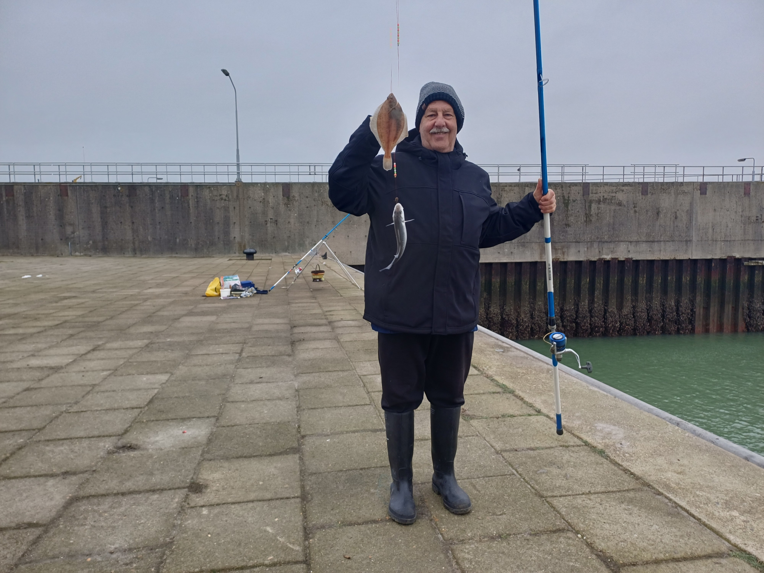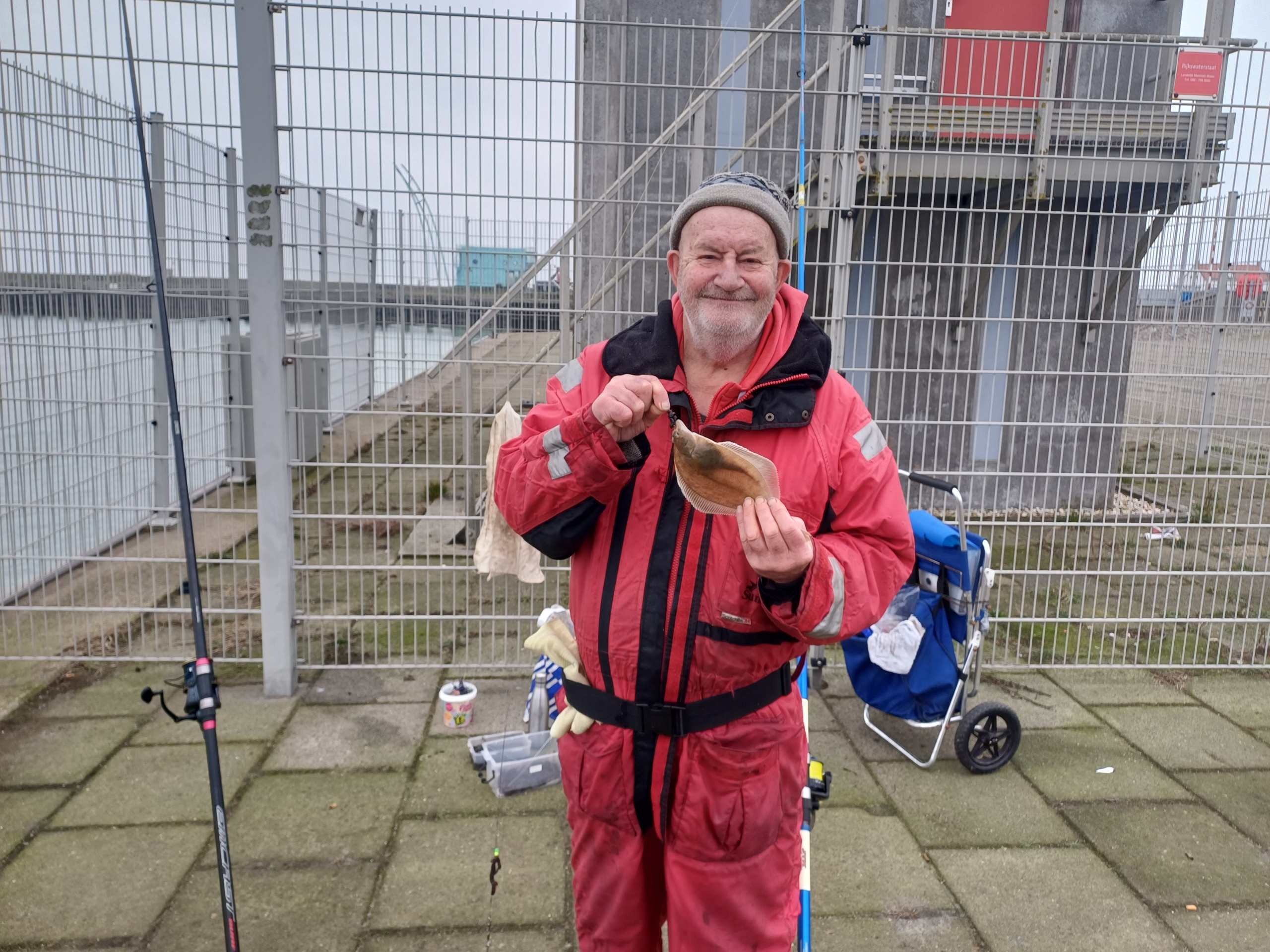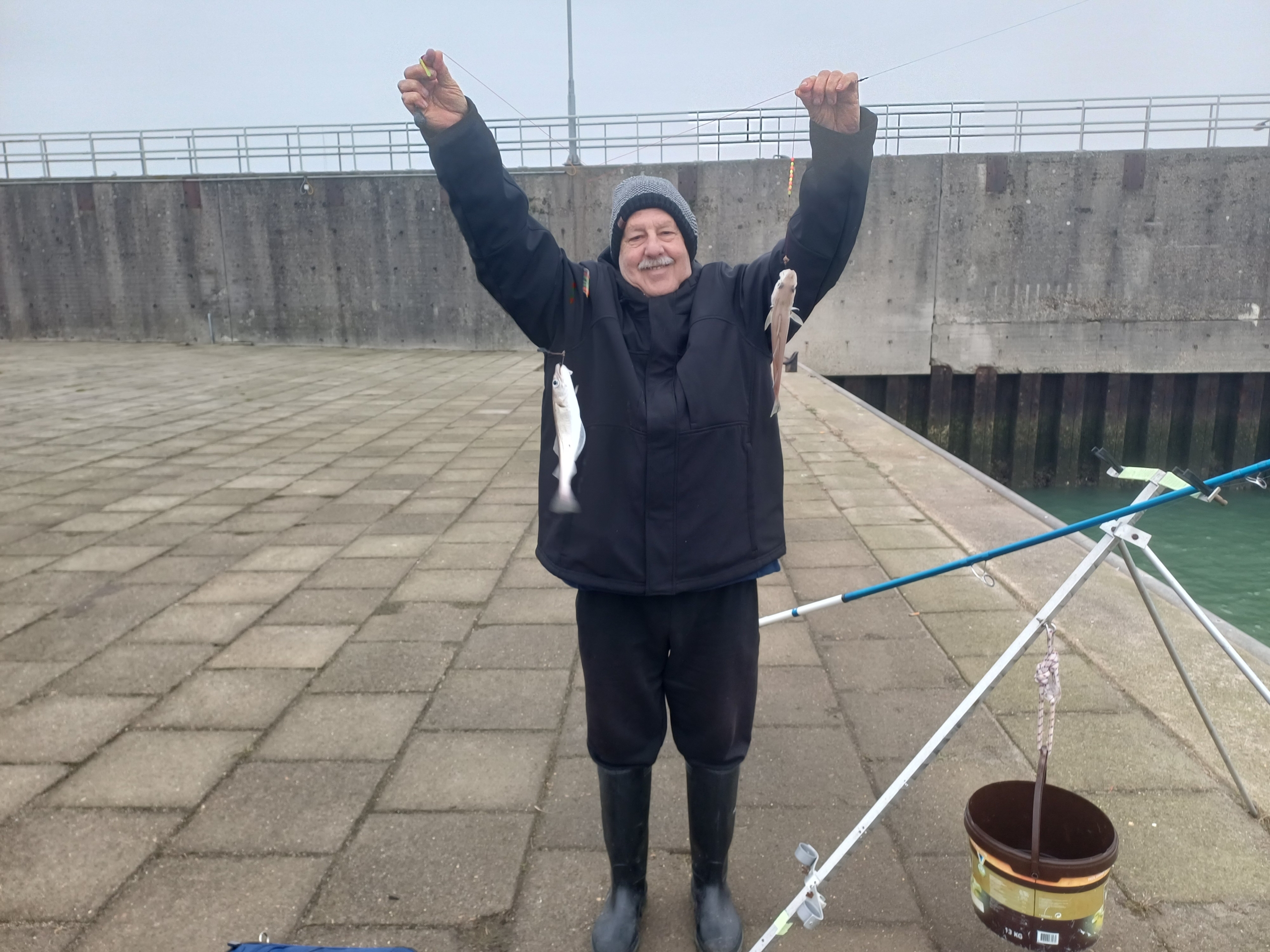 Zo we hadden afgesproken om te gaan vissen vrijdag de 12 december met me broer de pieren besteld bij de familie van dixhoorn was weer prima verzorgt en vertrokken na de stijger maar dat viel vies tegen geen plek dus na strand maar daar moet je betalen om gratis te staan later dus gebouwtje maar aangekomen moesten we weg handhaving zij hier mag je niet komen met de auto inverband met troep achterlaten dus maar gaan vissen auto op parkeer plaats gezet en alles klaar gezet een vissen en klopt er werd goed gevangen tot dat er 1 kwam vissen die roet in gooie die kon niet in gooide spoorniet maar hij had mij vast en me hengel brak in 2 en dan nog zeggen sorrie ik zij de handhaving komt zo en toen moest hij weg met de auto en dat deed hij maar kwam niet meer maar maar met 11 hengel verder eindstand was nico totaal 25 maal 2 zeebaarsjes 3 schar 20 wijting 2na mij toe ik had 15 wijting en2 schar om afte sluitengr jan en nico.