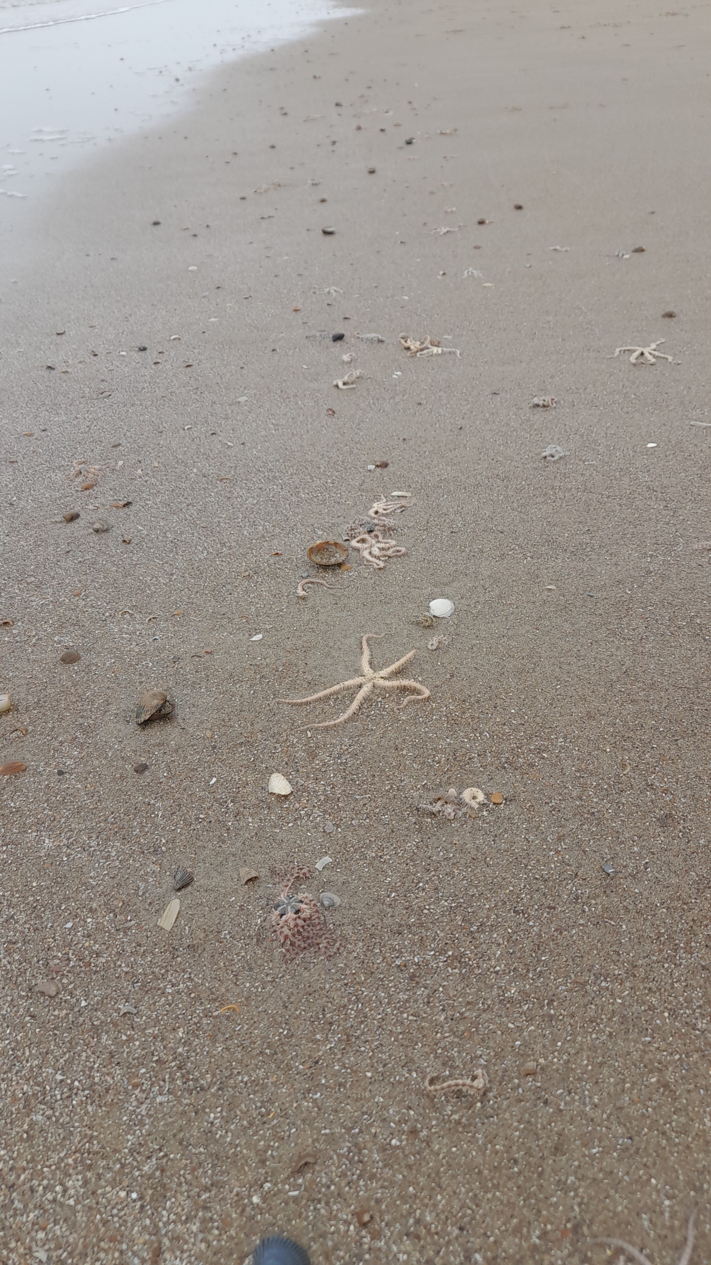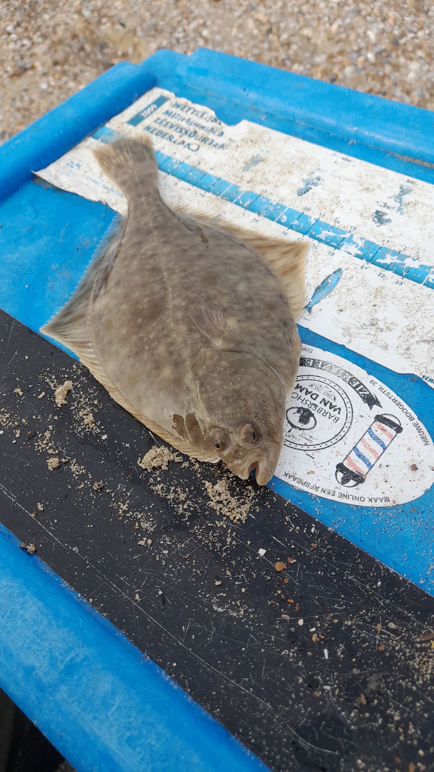 Vandaag t eerste wedstrijdje van Dreischor gevist van dit seizoen. Voor mezelf was t ook de eerste keer dit jaar met de hengels op pad. We visten aan de Punt Westenschouwen, met de bedoeling om te vissen van half tij naar hoog. Maar het water wilde niet meewerken, toen we om half twee begonnen zou het water al halverwege moeten zijn, maar het stond nog aan de laagwaterlijn. We laveerden tussen de muien op de korte laarzen en vonden er een plekje. Er stonden verderop nog meer hengelaars. Opvallend veel brokkelsterren in de branding. Na een paar worpen kwam Henk van de nul af met een vuile schar (19 cm) gevangen op volle afstand, dat gaf goede moed. Het water begon intussen als een malle op te komen en we werden verdreven van onze zandbankjes richting hoogwaterlijn. Ik viste afwisselend op volle afstand en dicht onder de kant, en zo nu en dan waren de piertjes eraf. In het laatste half uur kon ik nog een mooie standbot (27 cm)vangen, die hielp me van de NUL af en aan de eerste overwinning van het jaar.